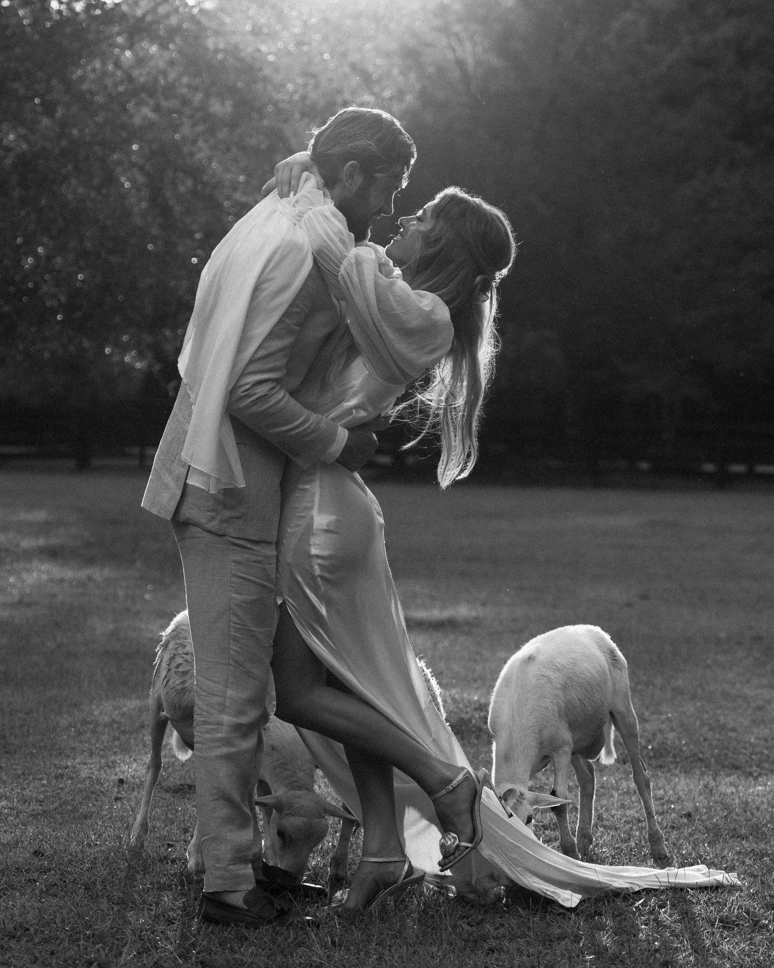 in love bride and groom with lambs visiting #weddingdress #weddingflowers #weddinginspo #weddingcake #weddingphotography Madeline Daniel #engagement #wedding #weddinginspiration